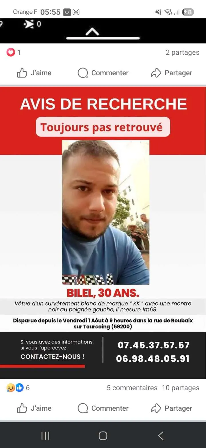 Il s apelle bylel il a 30 ans et suite au deces de notre maman il et venu cher moi je l heberger depuis 7 mois ca se passer bien juste qu il etait un peut depresif depuis ca separation et de ne plus voir ca fille il etait triste il ne sortait pas sans mois depuis 3 semaine le morale n etait pas au rdv il etait suivie psycatrie avec des trouble bipolaire mais sinon jamais il et partie sans donner nouvelle il na pas utiliser ces compte nous avons chercher france reseau sociaux tout ce qu on pouvait faire meme la belgique il a dues ce passer quelque chose le 3 aout un monsieur l aurait vue et y ma dit on dirait qu il etait perdu met l info na pas pue etre verifier ensuite le 5 aout un magasin peche en belgique mais pas eut retour du magasin il faut enqueter seule et c pas evident apres plus rien je precise il et partie sans argent vetement rien ni utiliser ces compte plus reseau plus telephone sont telephone a borne la derniere fois au canal a coter de cher moi le 3 aout alor quil a disparue le 1 er aout il avait un survet blanc une grosse montre noir et des basket nike avec des bande violette les cheveut court il a peur du monde voila si vous pouver m aider svp on a fouiller tout le long du canal a comine belgique personne ne la vue appart le (4 et le 5 aout a confirmer )