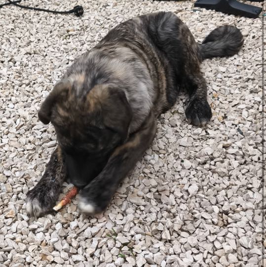 Couleur bringé yeux marron bout des pattes blanche et museau noir