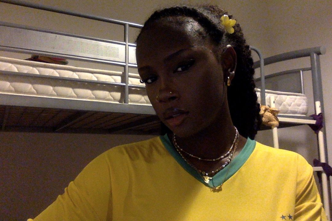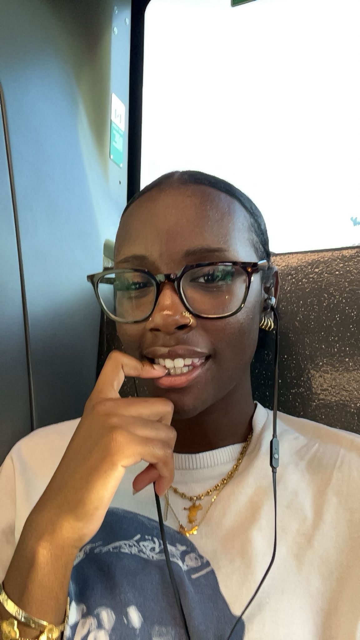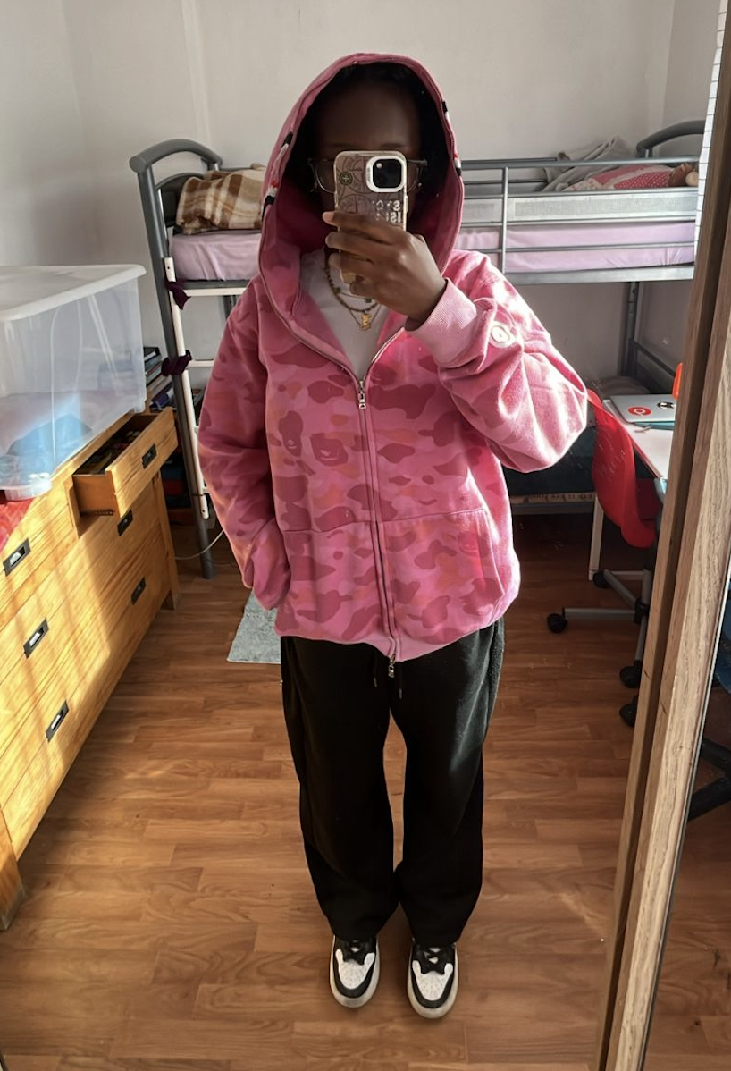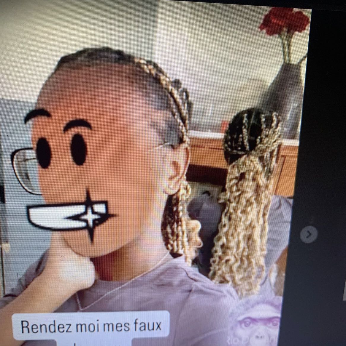 Porte des lunettes de vue, pull rose, bas jogging noir, basket Jordan blanc et noir, tresse cheveux avec rajouts blonde