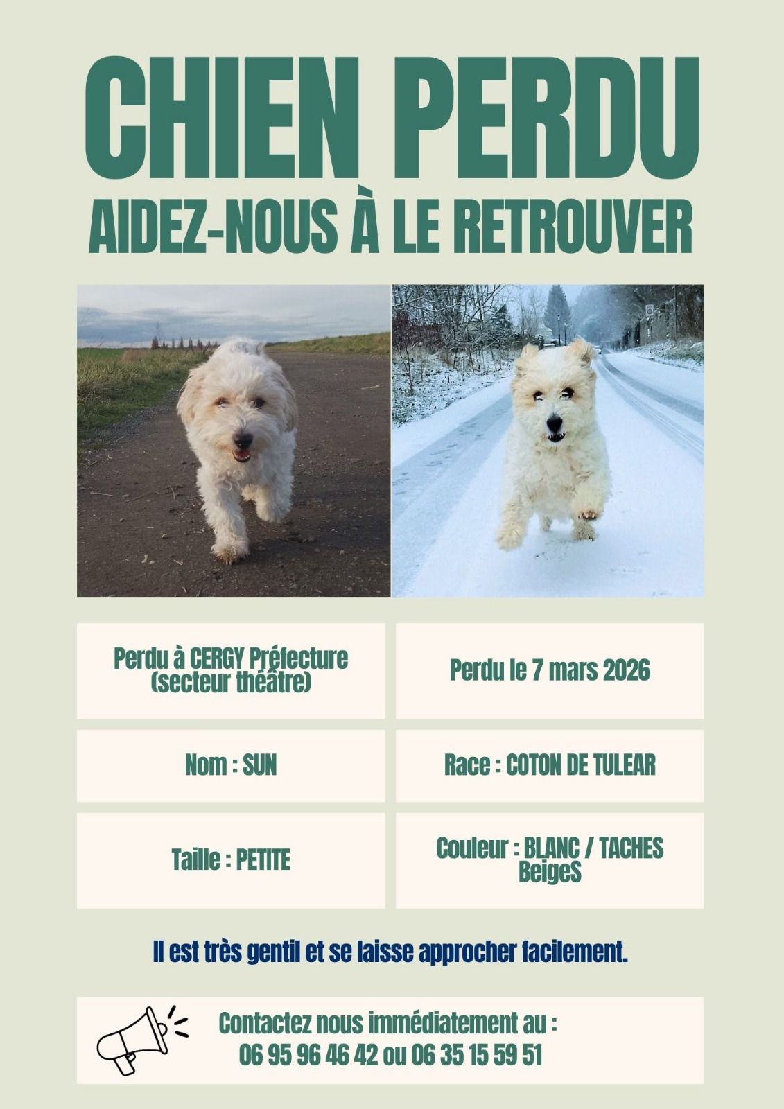 qui ne supporte pas de rester seul , il a des soucis de respiration quand il est stressé ,peureux mais très sociable avec les autres animaux et les gens . J'ai contacté les services concernés mis des affiches partout ,personne ne l'a vu depuis samedi soir juste avant minuit.