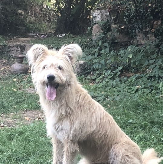 Elle porte un collier rouge. Elle a une oreille qui se dresse et l autre qui tombe