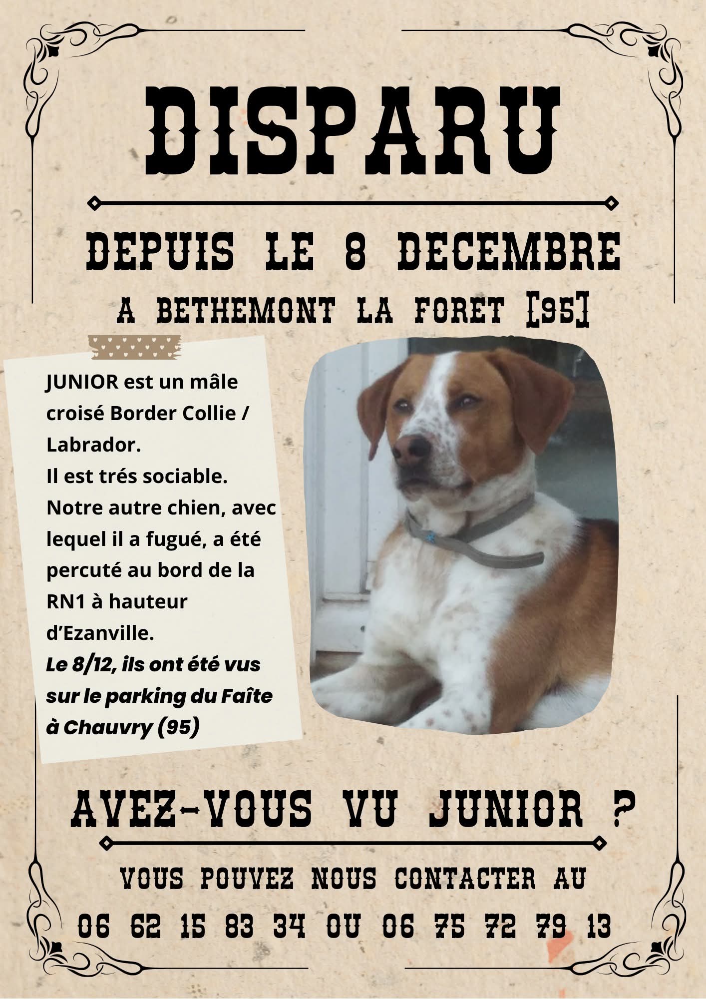Notre chien a fugué de notre jardin le 8 décembre dernier. Depuis nous n'avons eu aucune nouvelle nouvelle. Nous savons juste que son compagnon de fugue notre autre chien a été retrouvé sans vie au bord de la N1 au niveau d Ezanville (95)