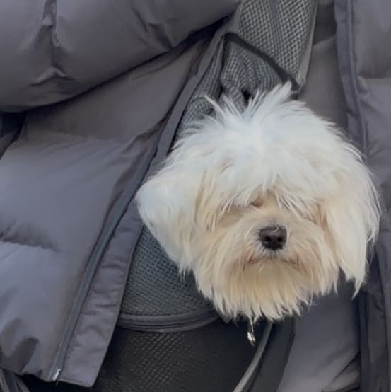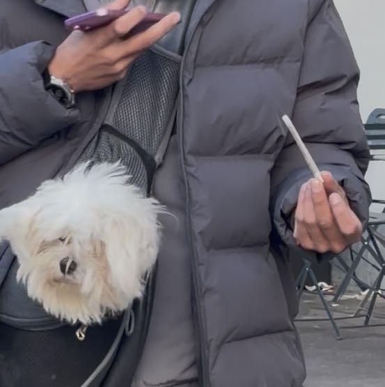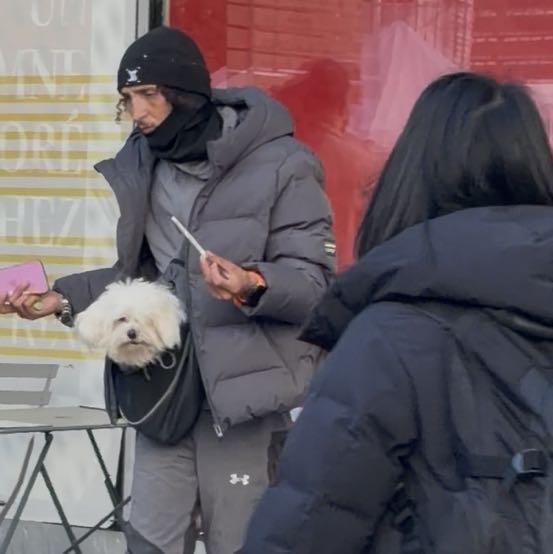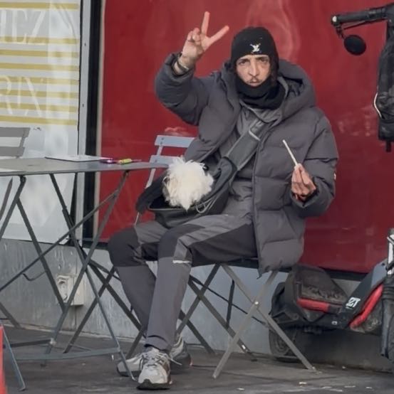 Jeune homme de moins de 30 ans, type maghrébin, taille moyenne, silhouette maigre. En survêtement, cheveux ondulés, mi longs. Le chien a l’air hagard, il cherche dans la foule… inquiet et tout ébouriffé. C’est un bichon, il n’a pas vu une brosse depuis des semaines apparemment… inquiétant au possible. Le jeune homme qui le détient a l’air très agressif