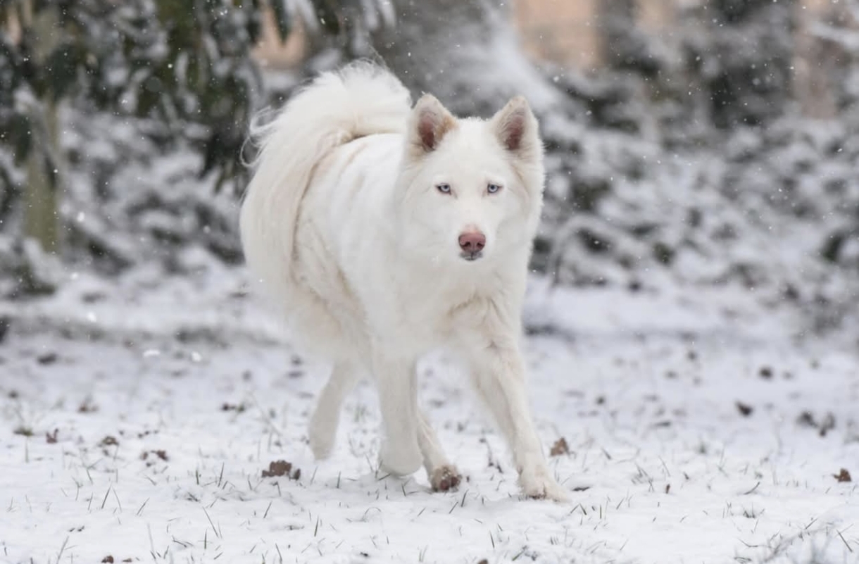 Chien blanc avec des taches crème sur le dos est le flan et un peux sur les oreilles yeux bleu queue en panache est de taille moyenne au caractère très douce et très sociable.