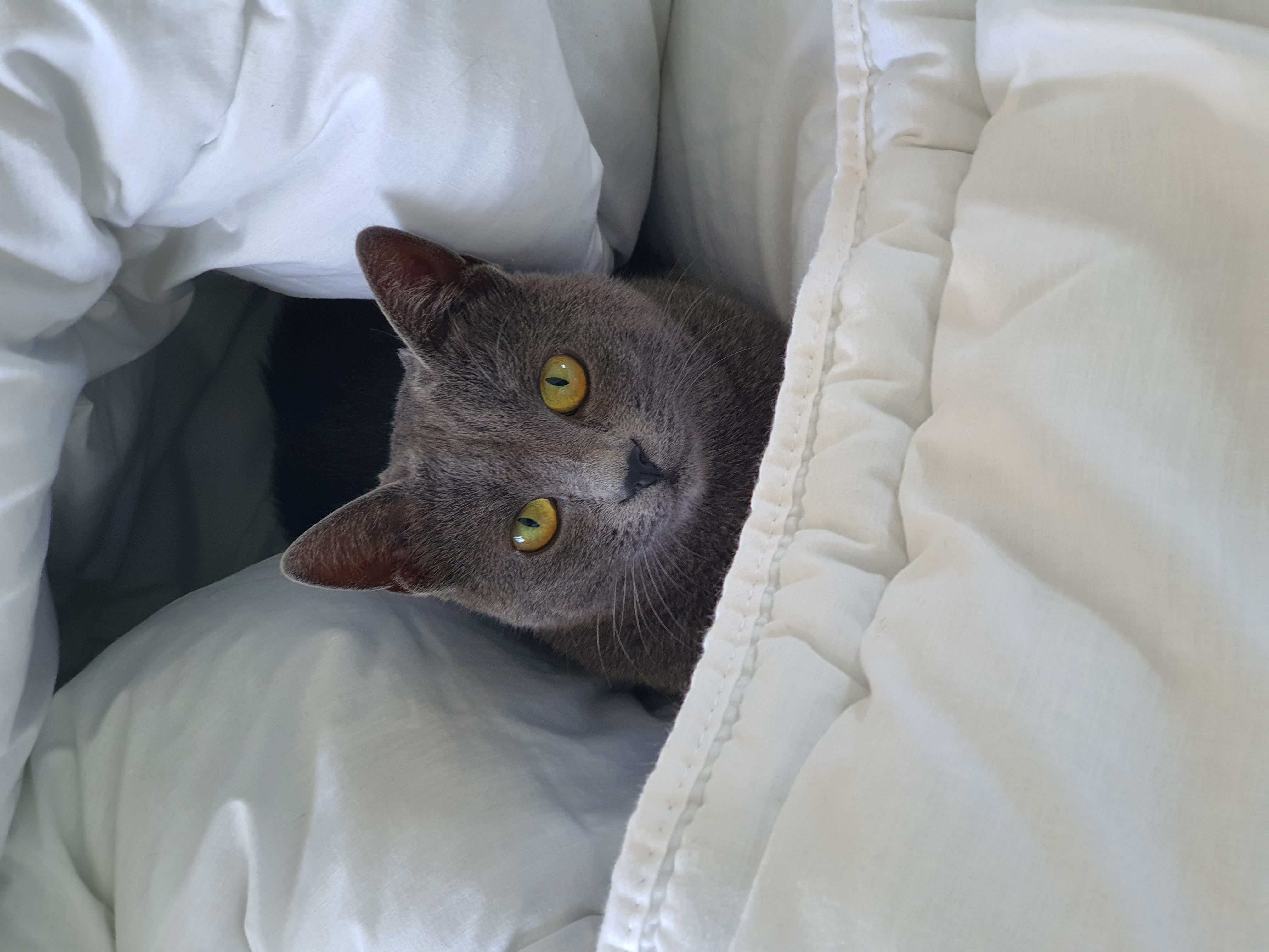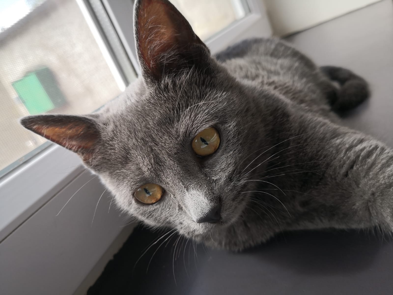 Petit gabarit, plutôt menue, de couleur gris anthracite uniforme, yeux jaune-vert